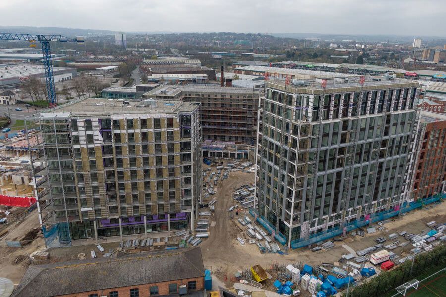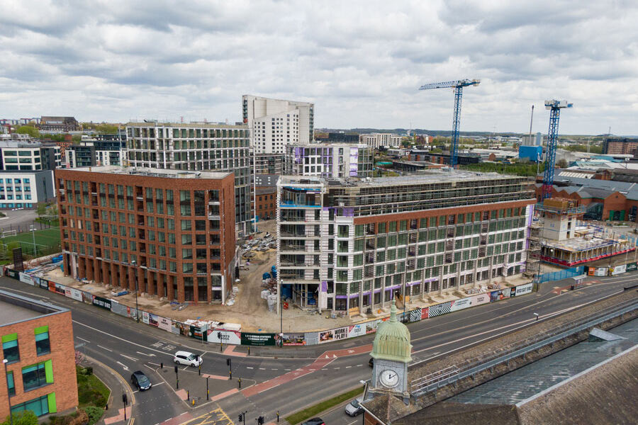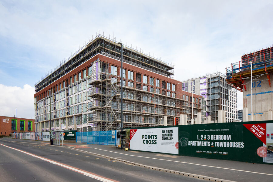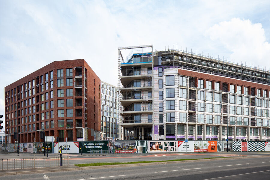 The Points Cross development sits in a spectacular piazza on Leeds South Bank waterfront, featuring 5 buildings of varying sizes. The 928 new build-to-rent residential homes comprise a mix of townhouses and apartments, as well as commercial and retail space.